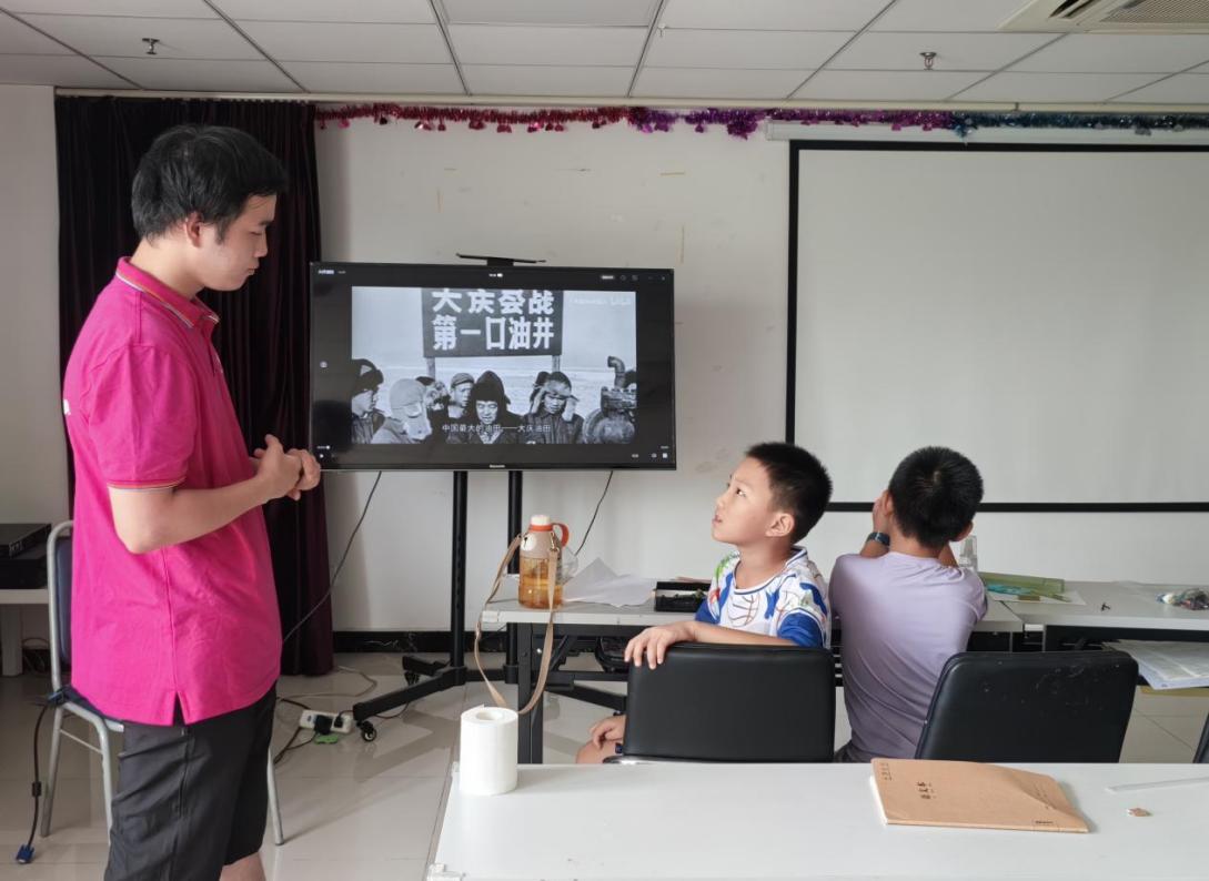 活动在社区的活动中心举行,现场气氛热烈而温馨。实践团以“石油时代的探险者:油田科学家的智慧与勇气”将课程徐徐展开,通过生动的讲解、有趣的互动和丰富的展示,让小朋友们对油田有了全新的认识,同时也将红色基因传递,深刻感受到了大庆精神的力量。