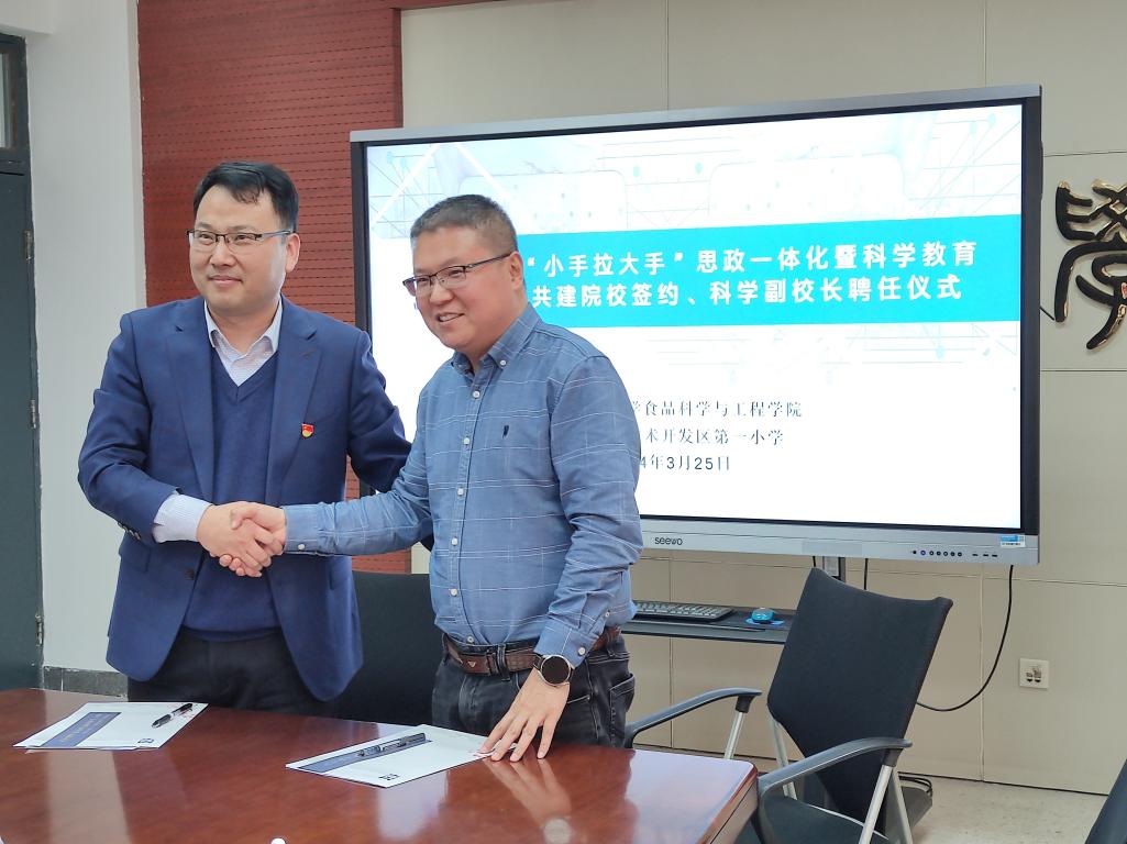 食品学院党委书记杜欣军与经开区一小党委书记李长合,分别介绍了两校的师资力量、办学历史等,对合作前景进行了充分展望。双方就共同深化合作,充分共享资源,形成协同育人新生态达成共识,并进行了“小手拉大手”思政一体化暨科学教育共建签约。