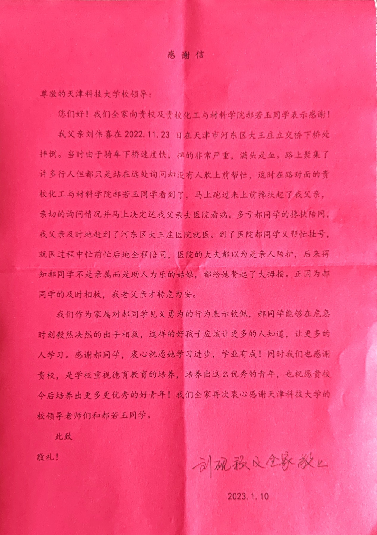近日,天津市南开区市民刘伟喜和其女刘砚颖来到学校,为我校化工与材料学院2021级研究生郝若玉同学送来感谢信,并向学校赠送“见义勇为莘莘学子,扶危救困祖国栋梁”锦旗。