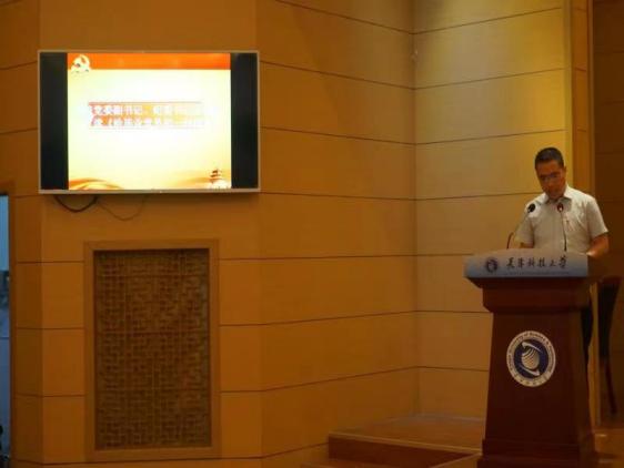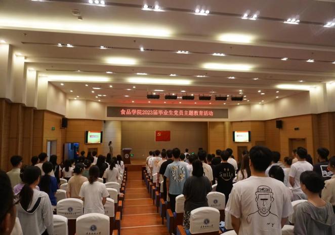 为激励毕业生党员以良好的党性修养、坚定的理想信念踏入人生的新征程。2023年6月19日中午,食品科学与工程学院党委在逸夫楼报告厅组织召开2023届毕业生党员主题教育活动。院党委书记杜欣军,院党委副书记、纪委书记聂慎德,辅导员张延宾、毕业生辅导员丁毓城及2023届毕业生党员参加活动。会议由专职组织员刘珊珊主持。