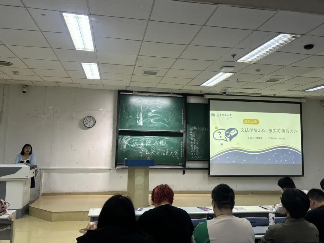 为进一步贯彻落实立德树人根本任务,全面推进我校“先锋计划”贯彻到底,努力提高人才培养质量。为帮助学生做好实习前的各项准备,推进实习工作的顺利开展。文法学院于2024年5月24日12:40在9-3阶举行2021级实习动员大会,法学系主任郭婧滢老师主讲本次会议。
