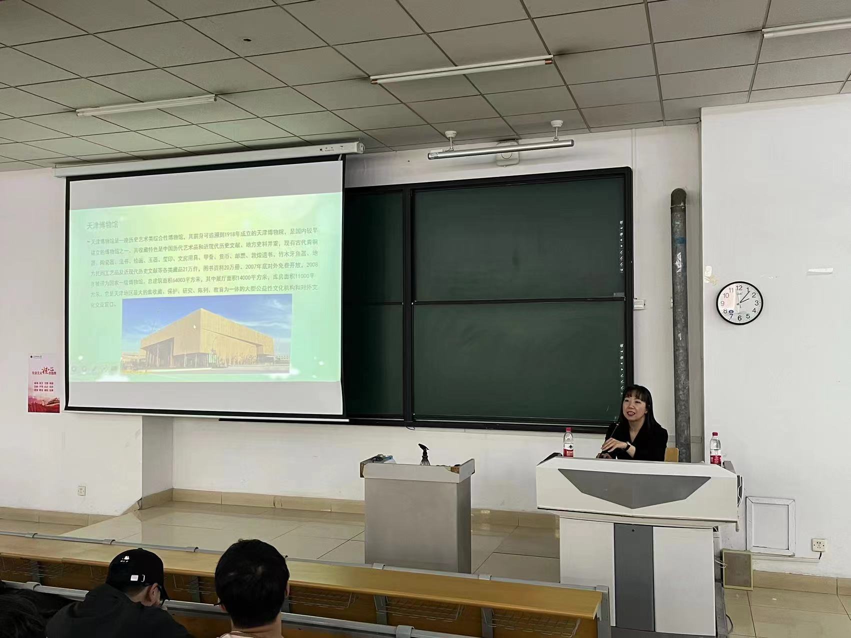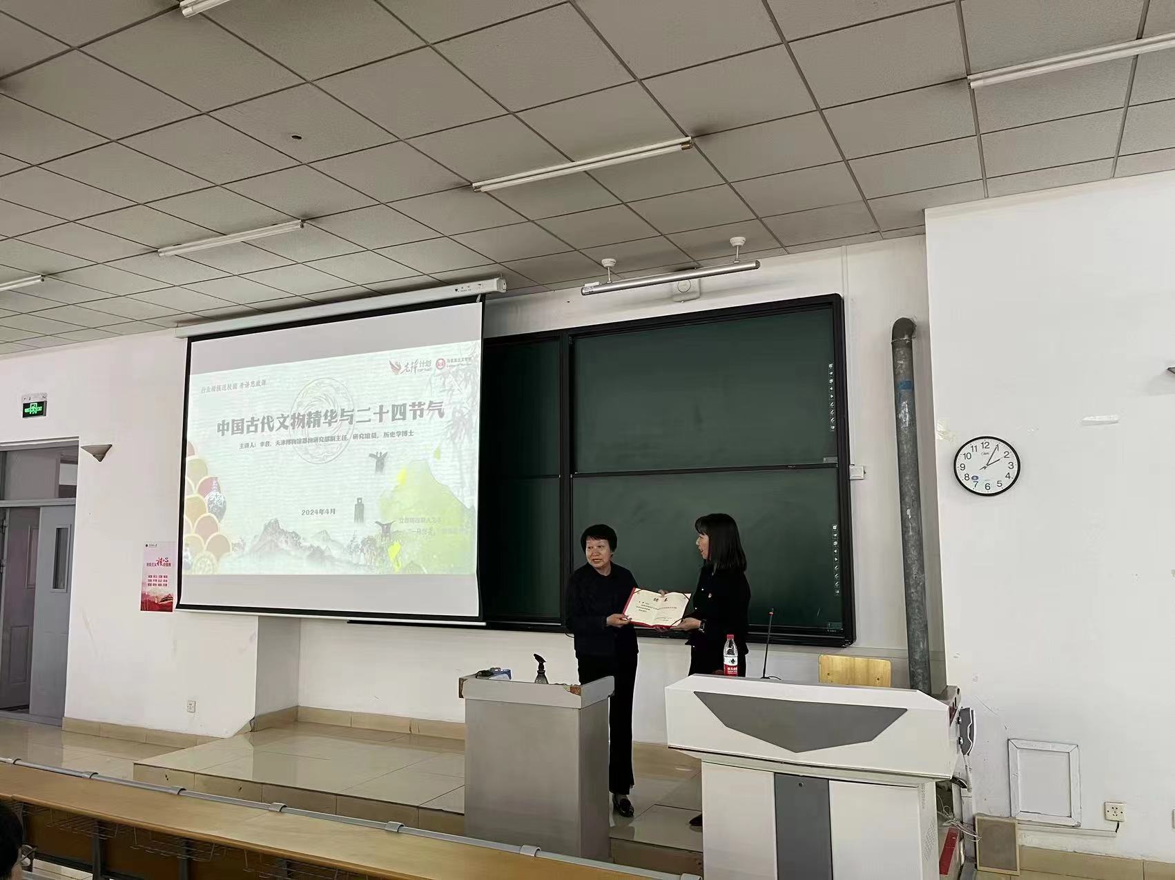 为深入学习宣传贯彻习近平总书记视察天津重要讲话精神,积极推进我校“大思政课综合改革示范校”建设工作,提升思政课教学实效,4月16日,马克思主义学院邀请天津博物馆器物研究部副主任李君研究员为电信学院本科生讲授了一堂以“中国古代文物精华与二十四节气”为主题的大思政课。