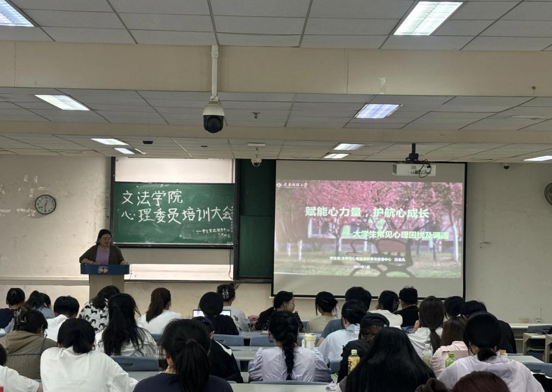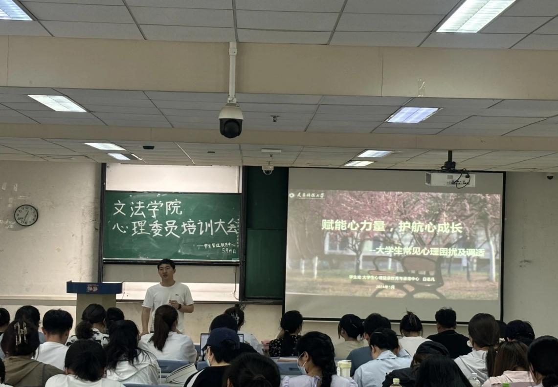 为进一步加强文法学院学生心理健康教育工作,增强工作实效性,明确班级心理委员工作职责,做好学生心理危机预警,促进学生身心健康发展,文法学院于5月14日12:30在9-12面向全体班委开展“赋能心 护航心成长”心理委员培训大会,由学生处大学生心理健康教育与咨询中心白志凡老师开展本次会议。