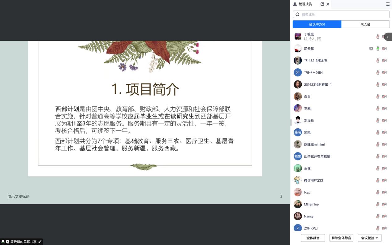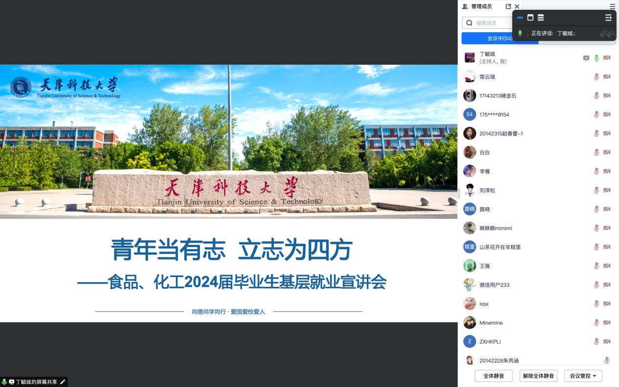 为引导毕业生扎根基层、服务基层,到祖国需要的地方建功立业,3月24日,食品科学与工程学院联合化工学院于线上举办以“青年当有志 立志为四方”为主题的基层就业宣讲会。此次活动由食品科学与工程学院2023届本科毕业生简云琪(“西部计划”志愿者)、孙淼(社区工作者),以及2023届硕士毕业生刘泽松(选调生)担任主讲嘉宾,活动共计80余名同学参加。