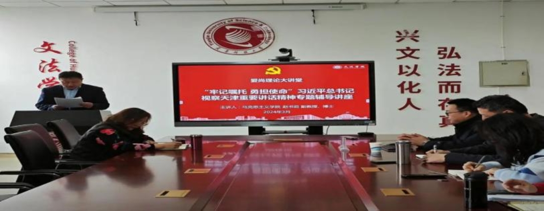 为做好习近平总书记视察天津重要讲话精神学习宣传贯彻工作,切实把全院党员干部师生思想和行动统一到习近平总书记重要讲话精神上来,把习近平总书记的殷殷嘱托全面落实到学院深入推进“先锋行动”的具体实践上来,3月7日13点,文法学院党委在滨海中校区7-310会议室举办“牢记嘱托 勇担使命”习近平总书记视察天津重要讲话精神专题辅导讲座,邀请马克思主义学院副教授赵书昭老师作“在发展新质生产力上善作善成,实现天津经济高质量发展”专题报告。学院理论中心组成员、全体教职工参加。
