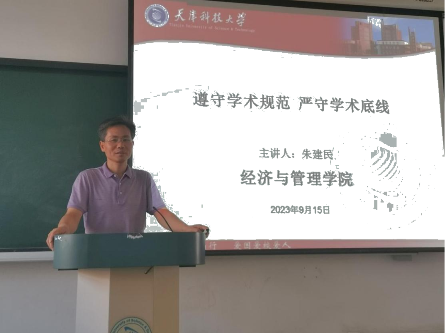 为进一步提升研究生的学术道德素养,激发同学们对学术的创新性、规范性,天津科技大学经济与管理学院于2023年9月15日在泰达校区中院3-406举行研究生新生入学教育之学术规范讲座,本次讲座由经济与管理学院副院长朱建民教授主讲,2023级研究生参加。
