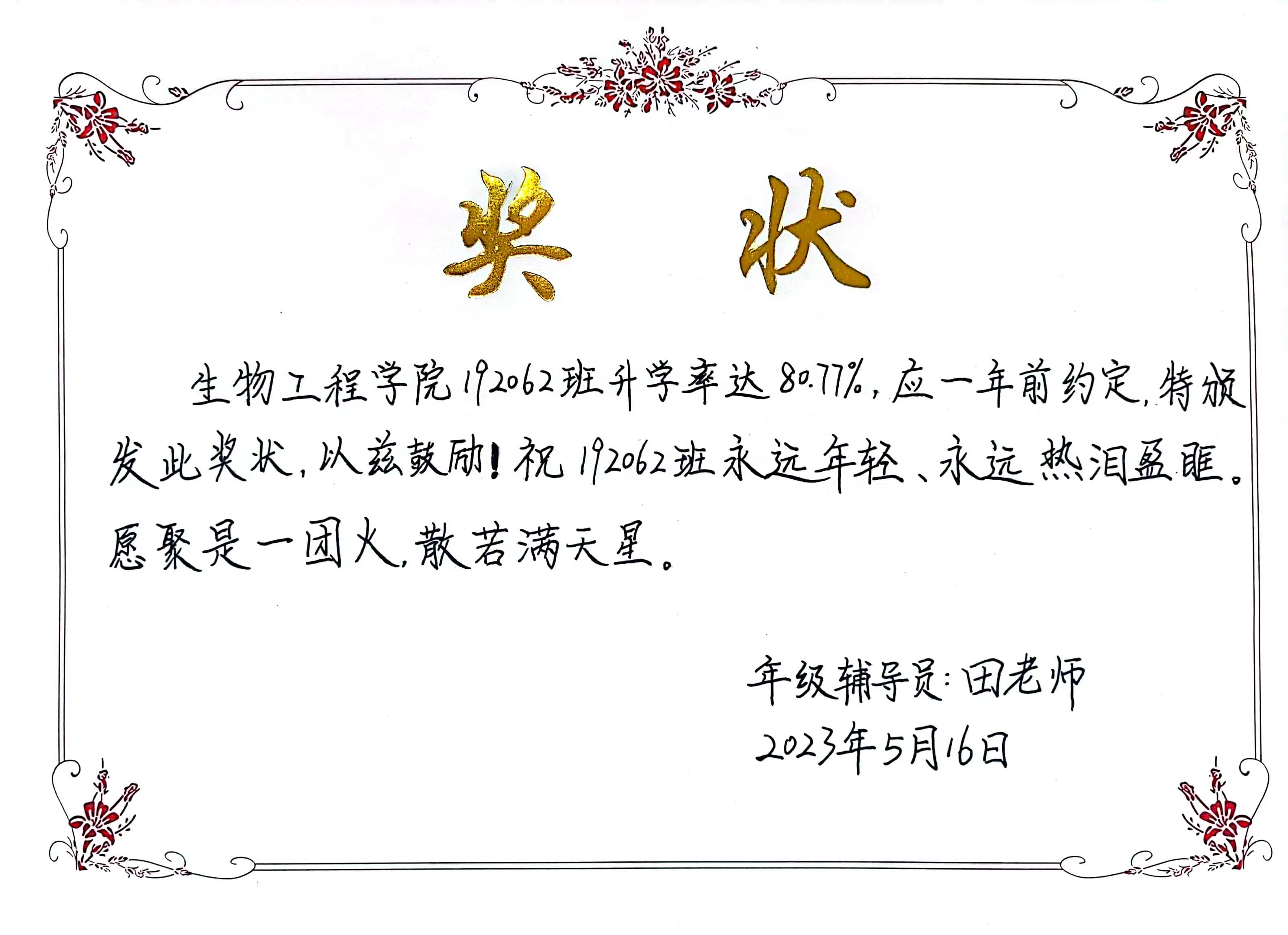 在此,同大家分享属于192062班的收获的喜悦,真诚的感谢生物工程学院领导、老师们对192062班全体同学四年的悉心培养和谆谆教诲。六月毕业季,向夏风许愿,于山海相见。愿此去繁花似锦,再相逢依然如故。