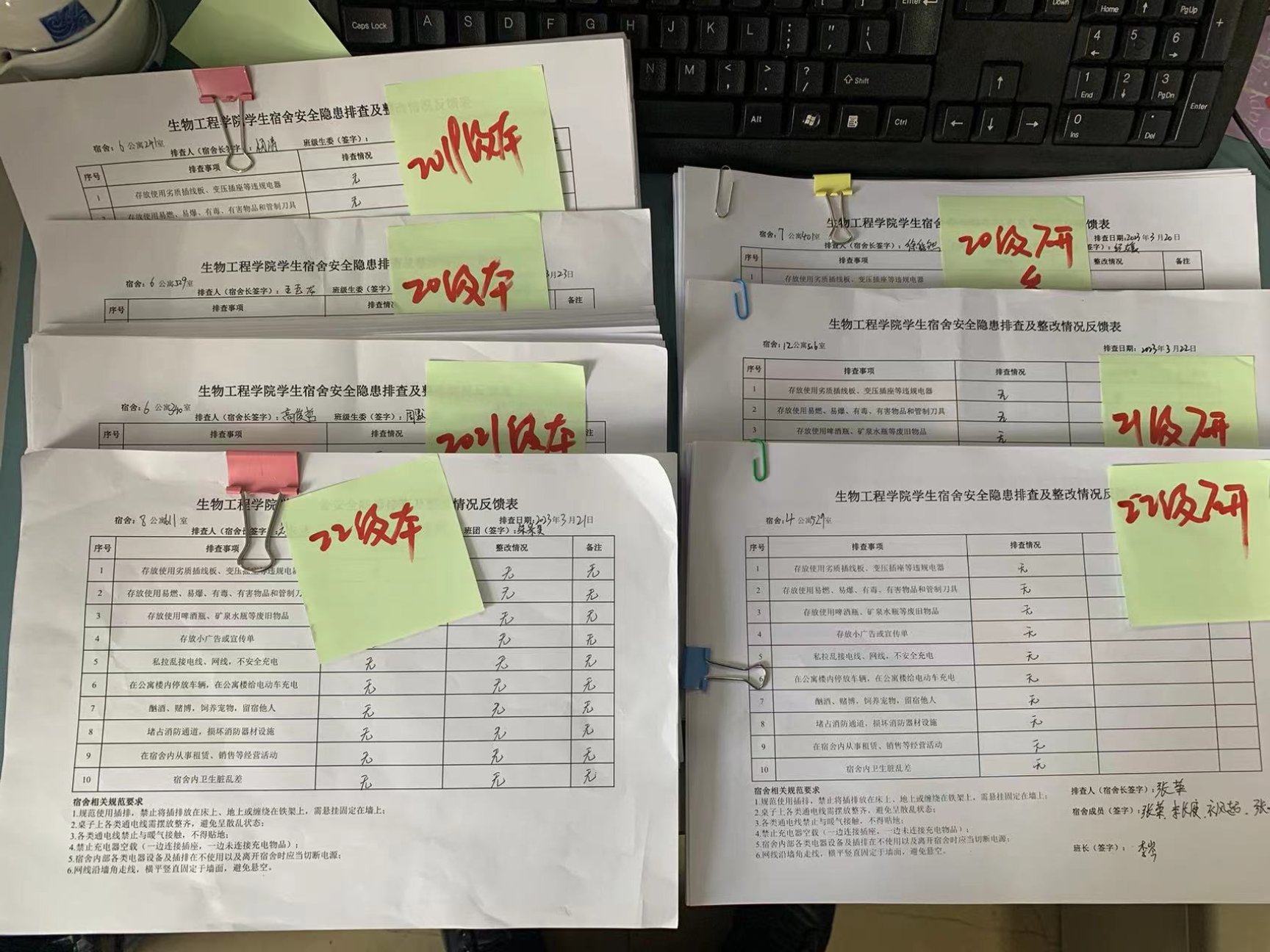 学院自3月20日下发《生物工程学院关于开展学生宿舍安全隐患排查整治活动的通知》后,全体学生宿舍网格员(宿舍长)会同宿舍成员先行开展认真自查,签写《生物工程学学生宿舍安全隐患排查及整改情况反馈表》。