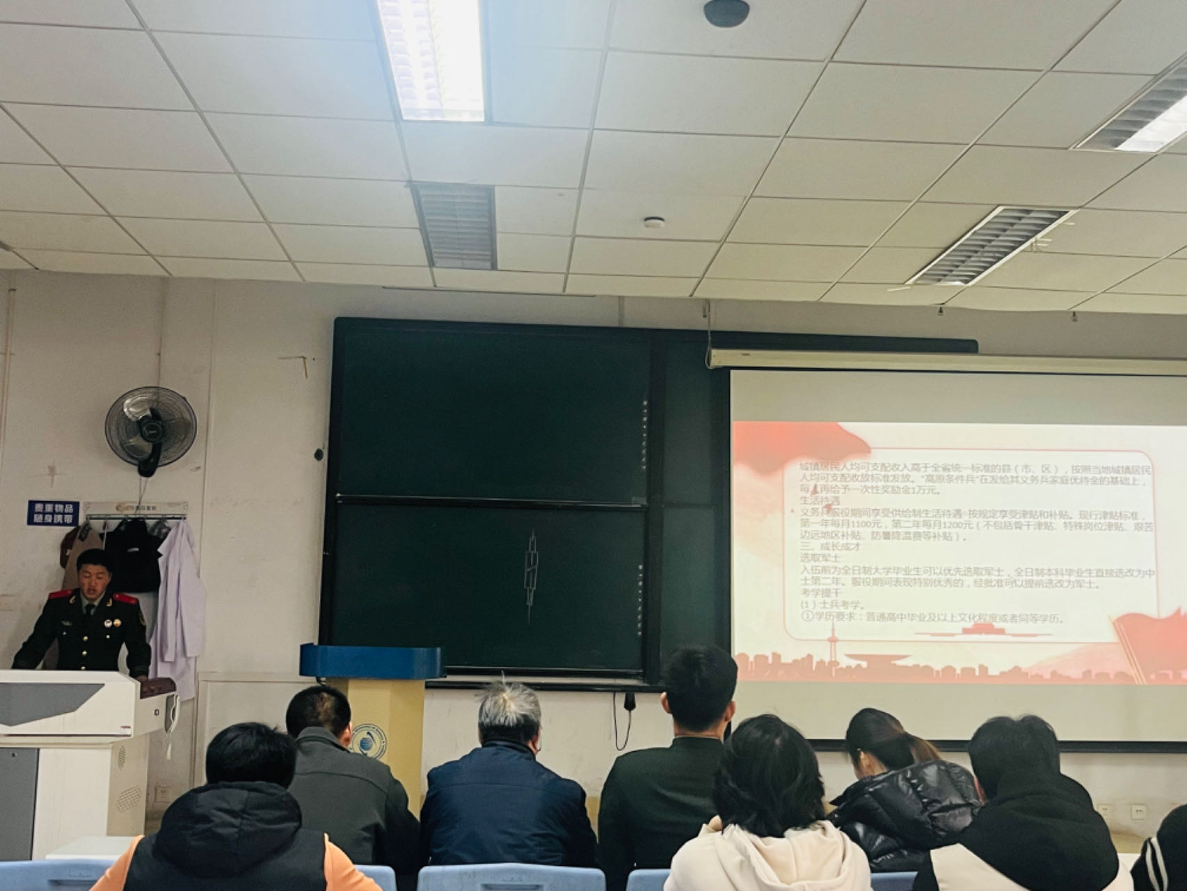 宣讲会上,学校人民武装部的宁振山老师作为主讲嘉宾,以生动的语言和详实的数据,向同学们深入解读了当前国家征兵政策。他详细阐述了入伍条件、选拔流程以及入伍后的待遇保障等各个方面,让同学们对征兵政策有了更加全面、深入的了解。同时,他还耐心解答了同学们提出的问题,消除了他们的疑虑。此外,学院还邀请了2018级退伍大学生肖健、2020级退伍大学生王雨童、2020级退伍大学生刘兴盛,他们分别分享了各自在军营中的生活体验和成长经历。他们讲述了在军队中锻炼意志、磨砺品质的故事,让同学们感受到了军营生活的独特魅力。