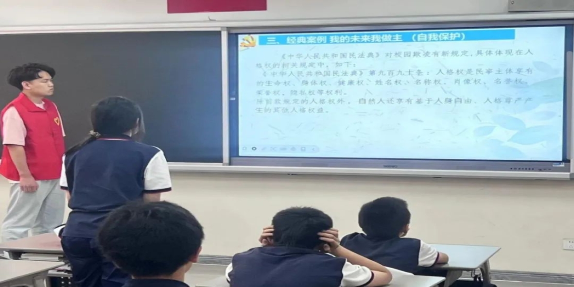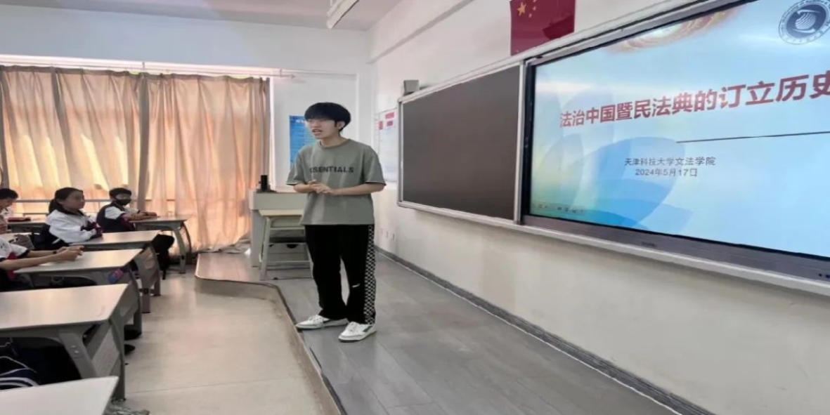 为深入学习贯彻习近平总书记视察天津重要讲话精神和全面依法治国理念的基本要求,顺利推进我校“先锋计划”实施,5月31日,我院文法学院团委实践团,团中央“星火燎原”宣讲团、“红星闪耀”宣讲团前往泰达二中开展“法治中国暨民法典的订立历史”主题宣讲活动。活动由团委副书记、实践团负责人刘桂银主持,实践团成员宋非凡负责内容宣讲,泰达二中7年级8班同学及相关负责老师出席。