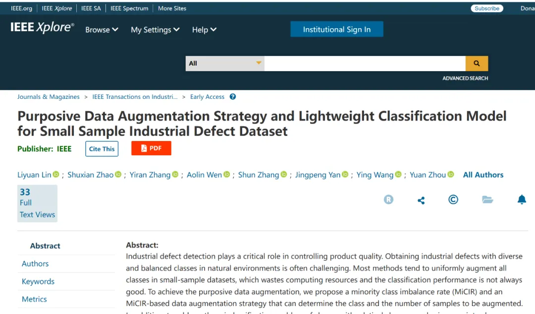 近日,天津科技大学电子信息与自动化学院林丽媛博士和研究生赵姝娴在计算机科学领域国际顶级期刊《IEEE Transactions on Industrial Informatics》(中国科学院一区TOP,IF="12.3)发表题为“Purposive" Data Augmentation Strategy and Lightweight Classification Model for Small Sample Industrial Defect Dataset”(DOI: 10.1109/TII.2024.3404053)的最新研究成果。该研究由天津科技大学、曙光信息产业股份有限公司、天津大学合作完成。我校为第一完成单位,林丽媛博士为第一作者。