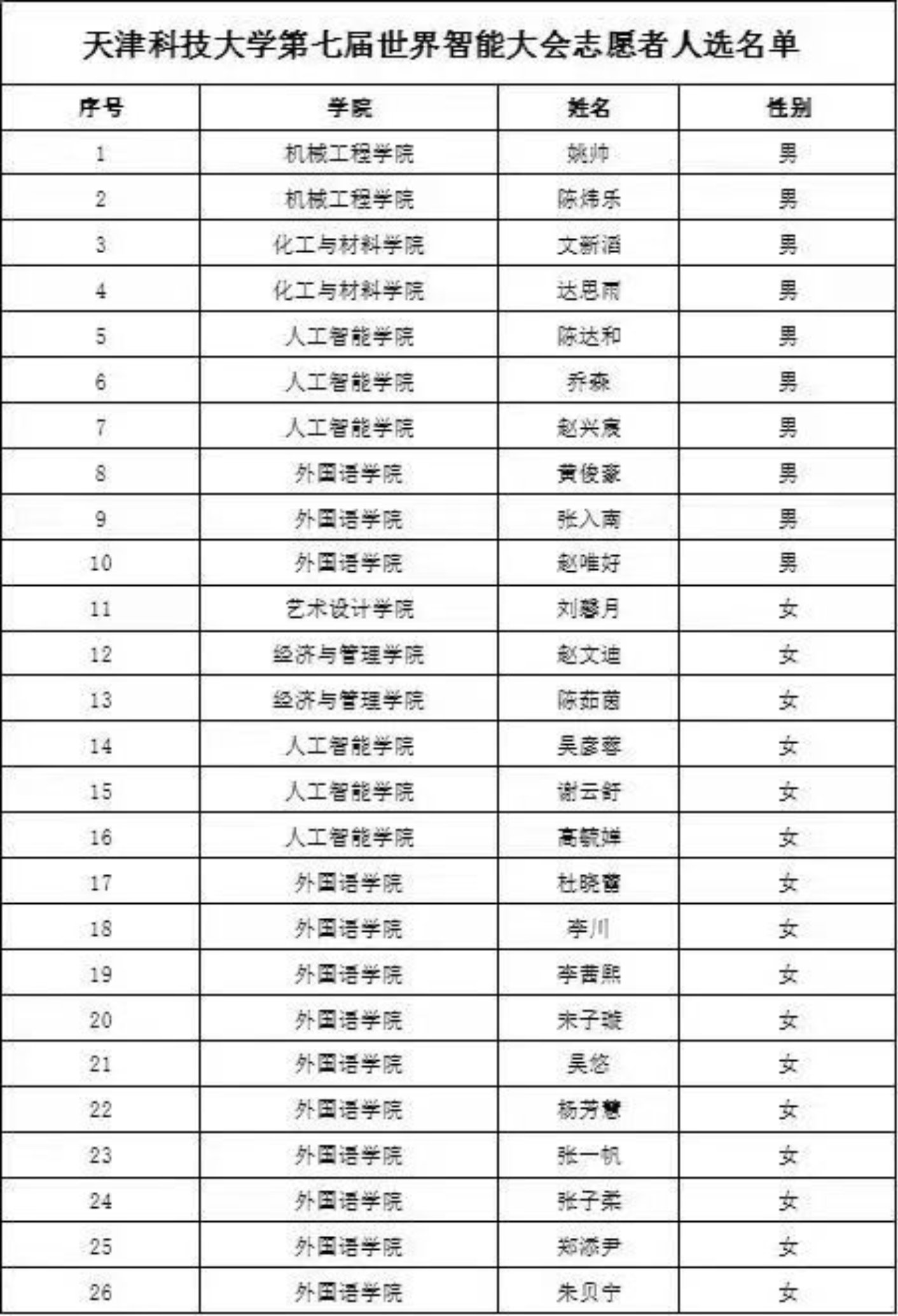 接收到学校关于世界智能大会志愿者选拔的通知,外院学生便踊跃报名。在学校的层层选拔中,外院学生充分发挥自身专业优势,展现较强的外语专业素养,最终经过学校团委高规格,严要求的面试选拔,外国语学院13名学生脱颖而出,当选为志愿者。外院当选志愿者名单如下:黄俊豪、张入南、赵唯好、杜晓蕾、李川、李茜煕、宋子璇、吴悠、杨芳慧、张一帆、张子柔、郑添尹、朱贝宁,希望当选的外院学生能够积极践行志愿精神,热情工作,发挥自身专业优势,为第七届世界智能大会的顺利举办贡献青春力量。