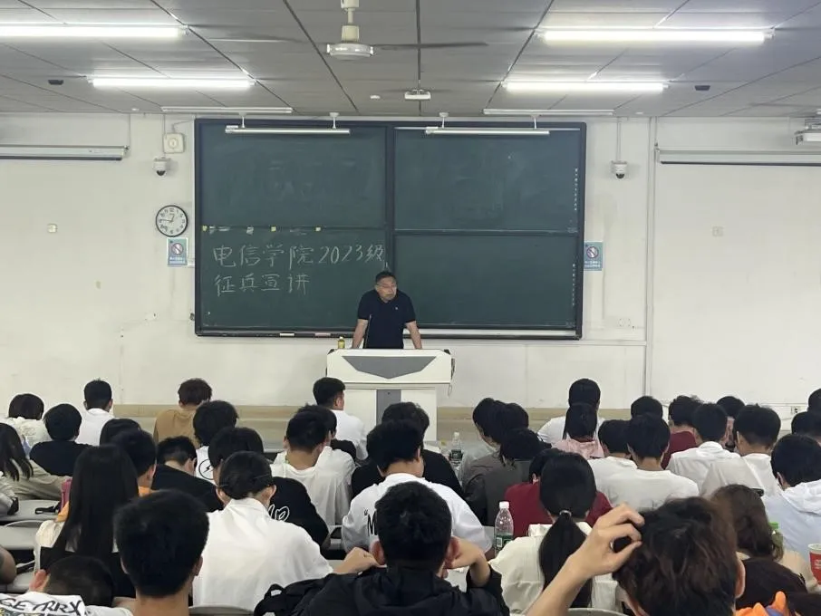 为深入学习贯彻习近平强军思想,落实我校“先锋计划”相关要求,扎实推进我院征兵工作,5月17日中午,电子信息与自动化学院邀请校党委人民武装部杨铎老师在主楼B202开展征兵政策宣讲会。宣讲会由2023级辅导员张锡嘉老师主持,我院2023级近400名学生参加本次活动。