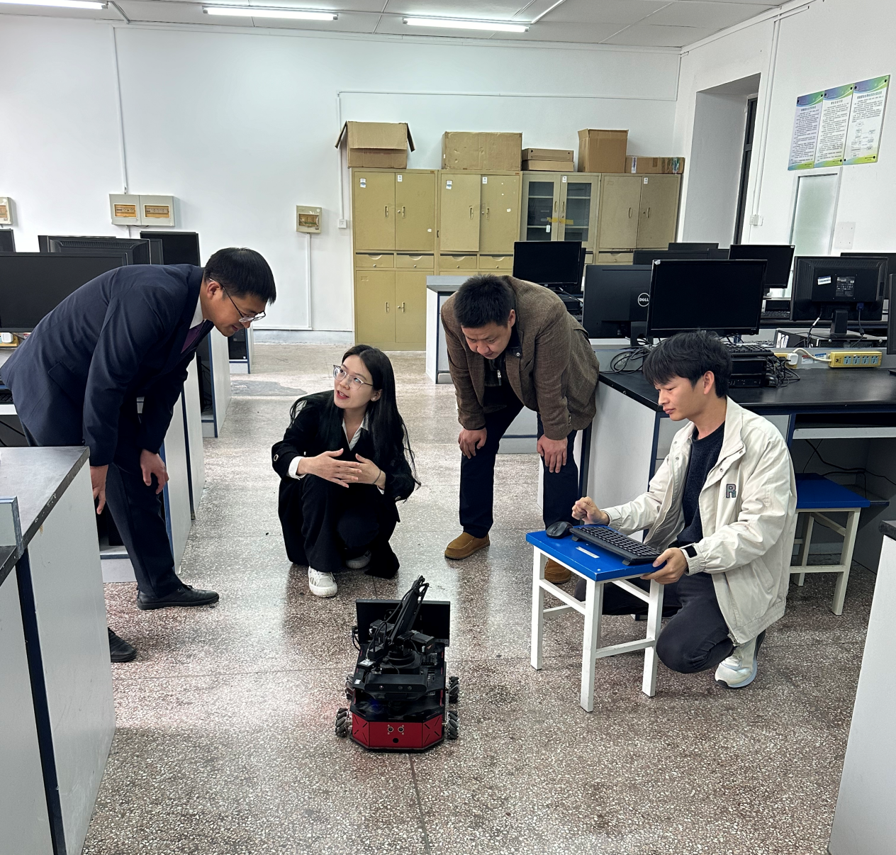 在学院实验室,孔研自老师为来访一行人介绍了现代机器人的基本功能和软硬件构成,演示了用键盘操纵机器人的移动、深度相机ROS驱动、利用机器人实现SLAM技术、人体跟踪等4个实验,并与来访一行人进行了互动。