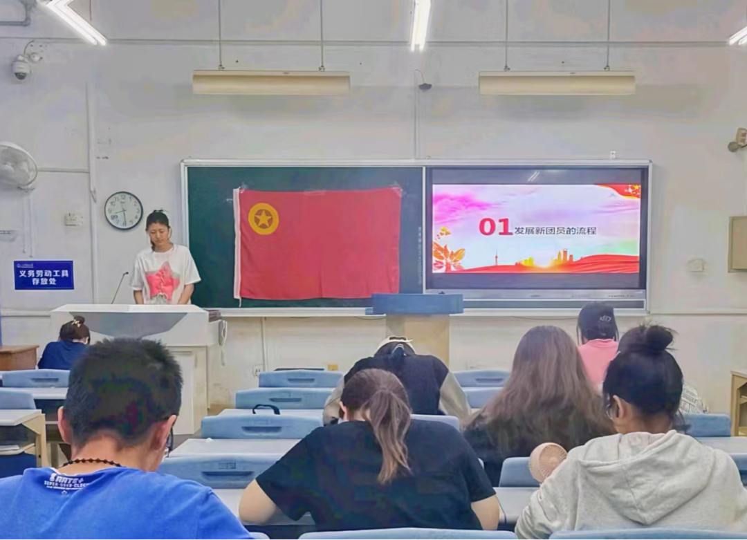 为了深⼊学习贯彻习近平新时代中国特⾊社会主义思想,全⾯学习、全⾯把握、全⾯落实党的⼆⼗⼤精神,在两个文明建设的实践中,锻炼成为有理想、有道德、有文化、有纪律的优秀青年,外国语学院于5⽉25⽇晚8:30,在3-112教室开展⼊团积极分⼦第四讲。这次团课从发展新团员的流程,培养优秀团员意义以及共青团优秀团员事迹三个方面展开讲解。