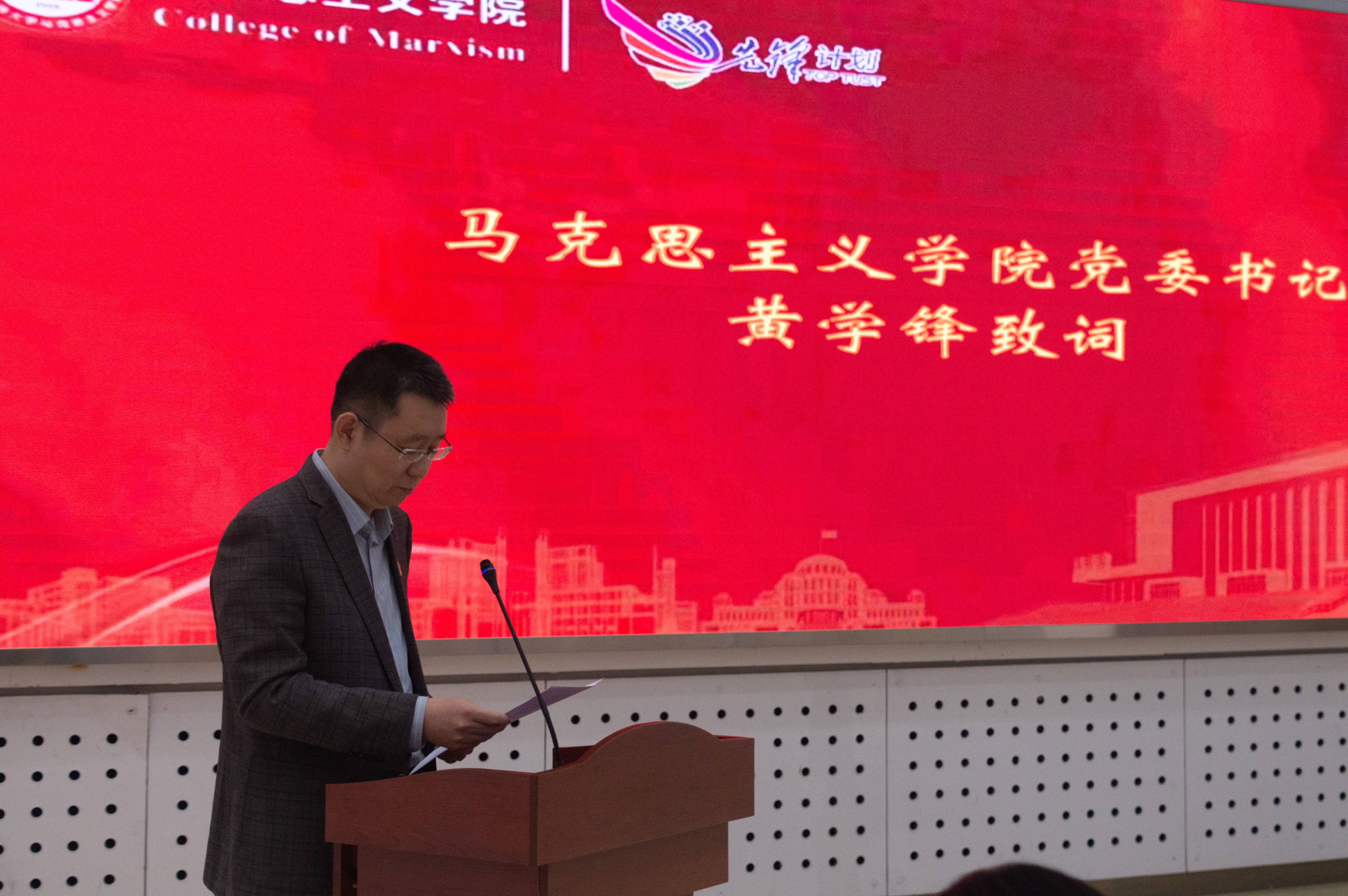 黄学锋代表学院党委致辞祝贺。黄学锋指出,研究生会的成立是学院发展史上的一件大事,是提升研究生教育管理水平的重要一步,也是研究生实现自我管理、自我服务、自我教育的重要平台。马院学子要始终坚持以习近平新时代中国特色社会主义思想为指引,团结青年、服务同学、引领同学,在志存高远与脚踏实地中接续奋斗。并对研究生会的工作提出四点要求:一是勇做习近平新时代中国特色社会主义思想的坚定信仰者、忠实实践者和弘扬传播者,立言立行发挥表率作用。二是坚守用心用情用力的服务本色,打造具有执行力和凝聚力的组织。三是厚植“一马当先、自信自强、厚学笃行、勇攀高峰”的学风文化,做好“攀登讲堂”文化品牌。四是打造一支乐于奉献、敢打头阵、勇做先锋、善作善成的骨干标兵队伍,以高度责任感和使命感服务学院学校发展。