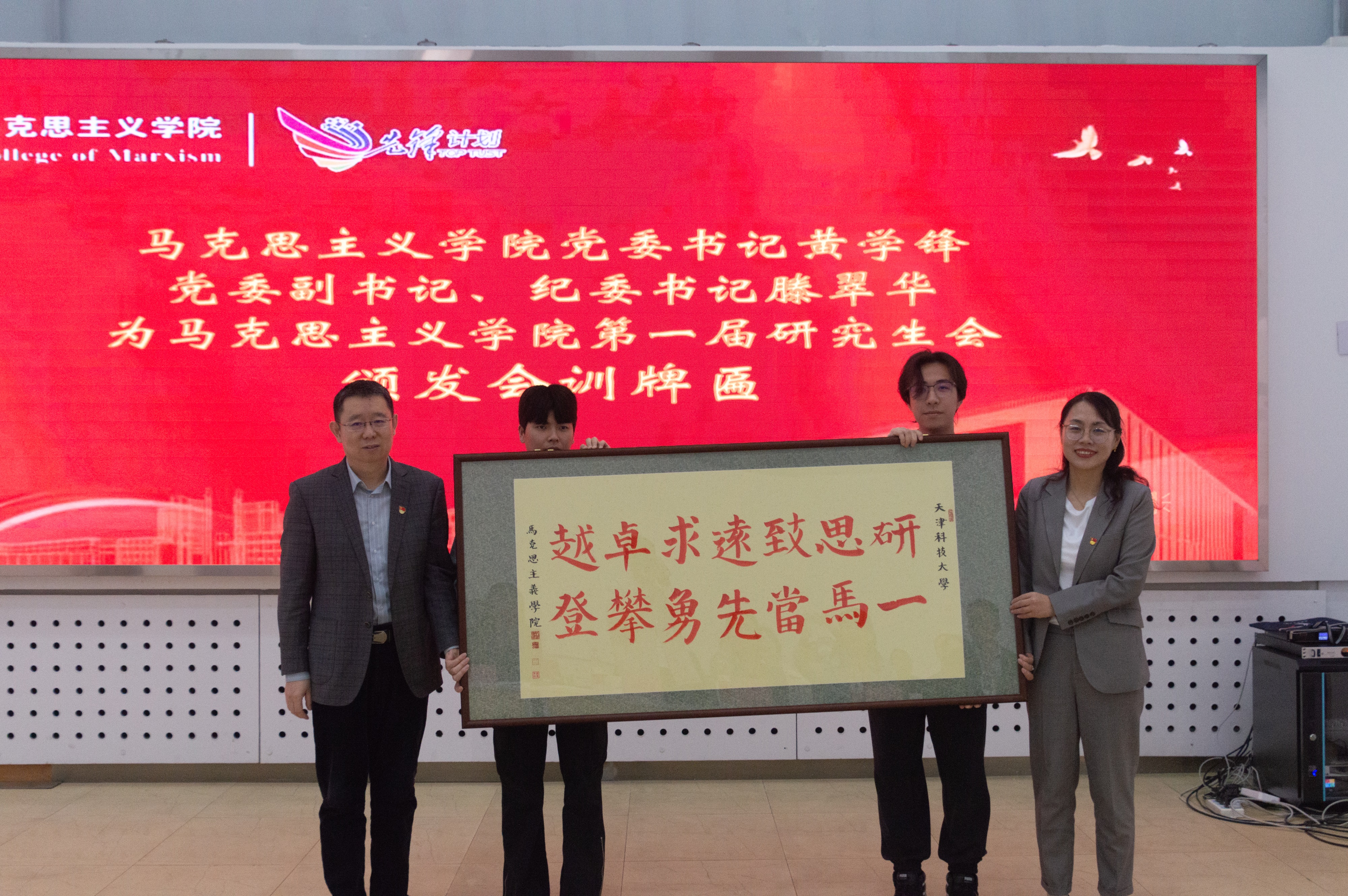会训蕴含文化属性,彰显文化气质。黄学锋、滕翠华为学院第一届研究生会颁发会训牌匾,师与生21人的红手印按下了使命与担当。“研思致远求卓越 一马当先勇攀登”成为马院学子的奋斗标识。