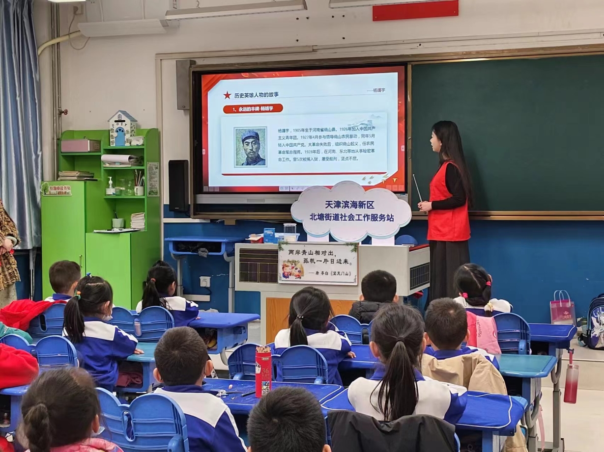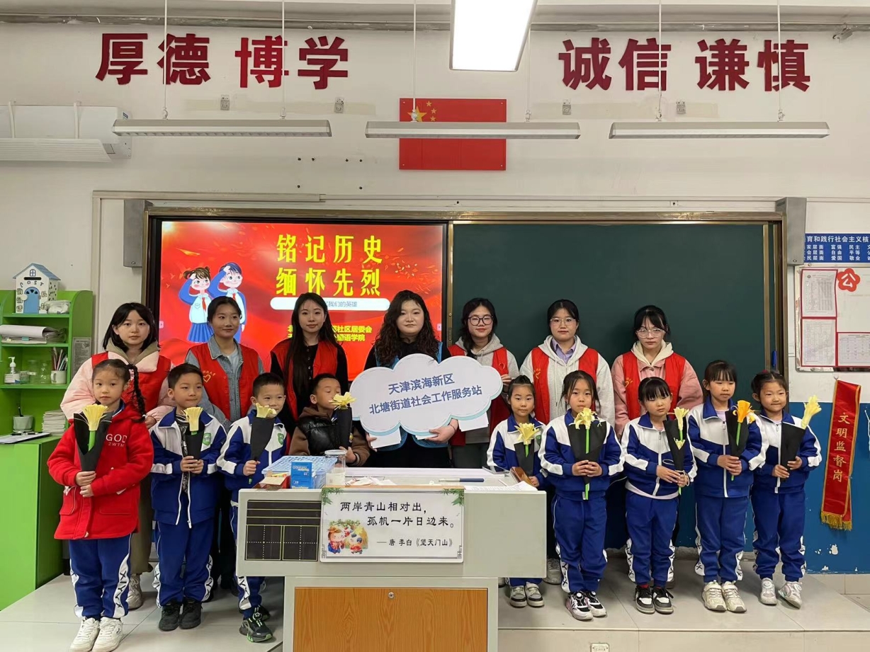 清明节来临之际,为深入学习贯彻习近平总书记视察天津重要讲话精神,缅怀革命先烈,传承红色基因,积极推进大中小学思政一体化建设,4月2日下午,天津科技大学外国语学院联合北塘街道社会工作服务站、新雅苑社区工作人员共同前往欣嘉园第一小学开展“缅怀先烈 吾辈自强”清明节红色教育活动。