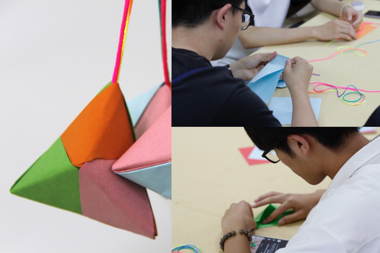 此次活动立足于包粽子和佩戴五彩绳的文化习俗,创新活动形式,采用线上教学配合线下指导的模式让学院学生通过实践感受端午佳节的氛围,锻炼动手能力和创造力。活动现场,工作人员将彩纸、彩绳分类摆放,志愿者们齐聚一堂,共同讨论学习、分享经验。考虑到视频讲解的局限性,工作人员付海杰走到每一位志愿者旁并亲自示范,耐心观察工作进度,针对性地进行提示和引导。在温馨热闹的氛围下,一个个敦实可爱、色彩斑斓的纸粽子在志愿者手中诞生。五彩绳是端午节传统的民间工艺品,寓意着祈福纳吉。从打结到编花,再到串珠系扣,志愿者们全神贯注,没有丝毫松懈,诉说着对传统文化的热爱和敬意。