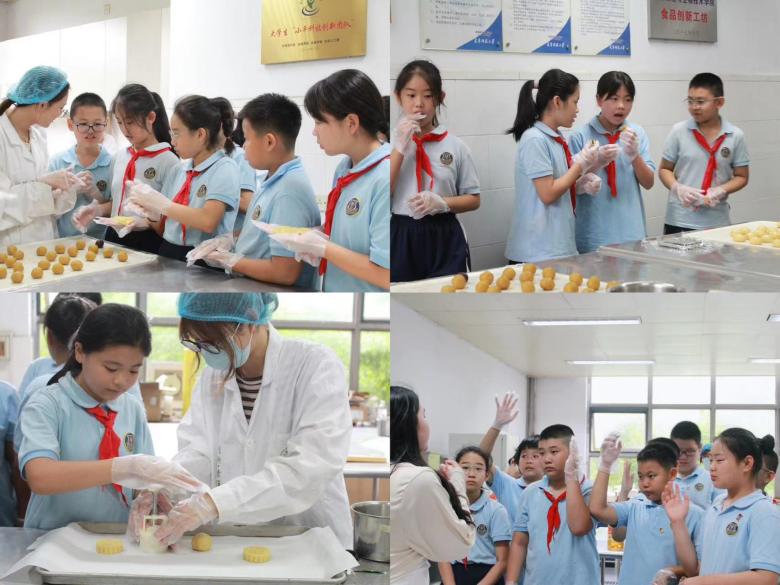 随后,学生们来到了食品创新工坊实验室,参观月饼制作工艺。工坊成员首先向同学们说明进入实验室的注意事项,强调安全第一。同学们在品鉴由食品创新工坊烤制完成的月饼后,开始学习月饼的制作过程,在工坊成员的示范与指导下,孩子们掌握了制作月饼的要领,并体验到亲手制作食品的乐趣。“为什么要刷两次蛋黄液呢?”“为什么月饼刚放进烤箱时温度要稍微高一些呢?”在给月饼刷蛋黄液后放进烤箱后,同学们发出自己的疑问,工坊成员用活泼幽默的语言耐心给予回答。通过这种实地参观和动手实践的学习方式,同学们在美食制作中学习到了很多食品知识,不乏乐趣而又能牢记知识。