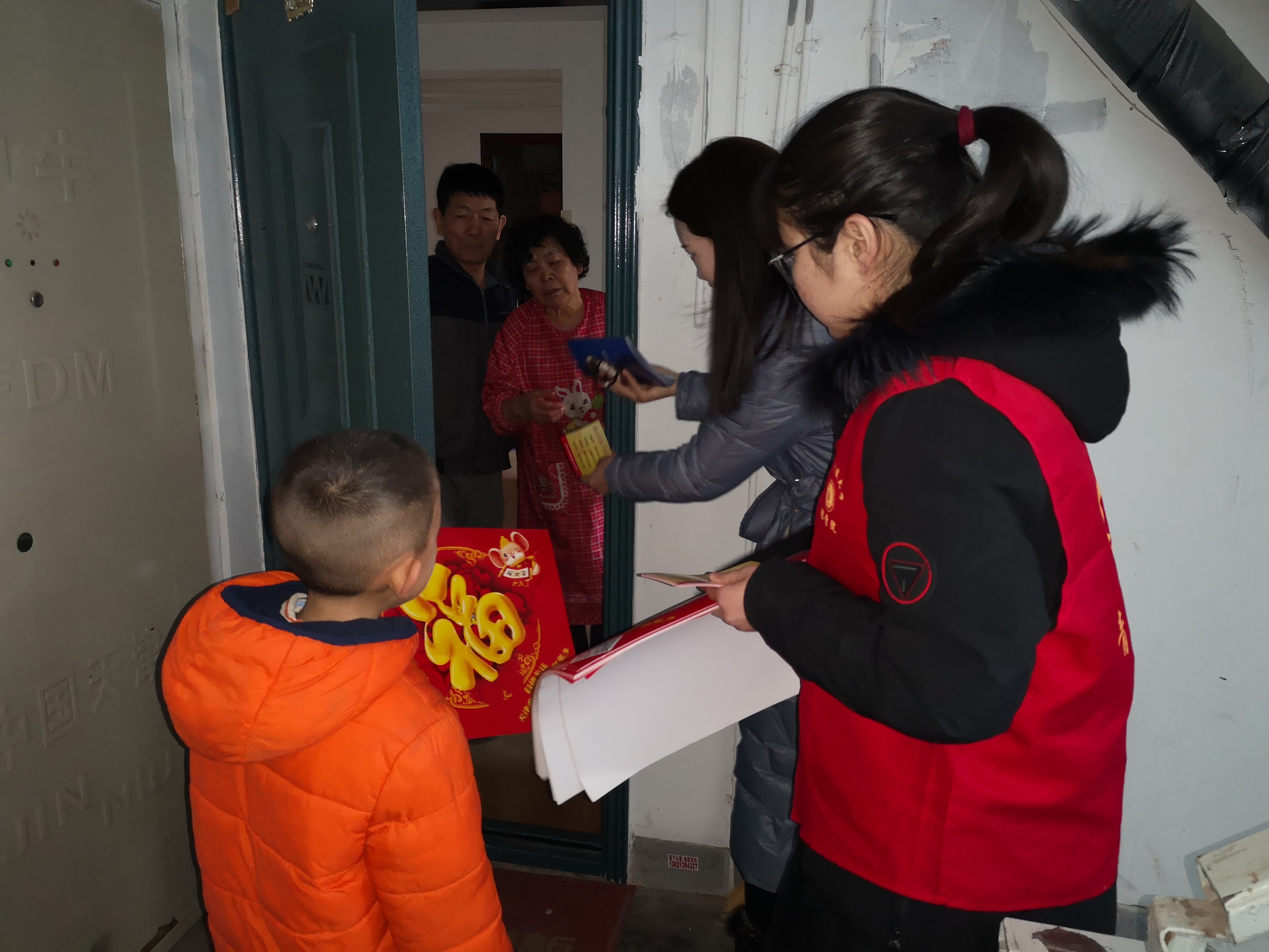 志愿者们两人一组,分别来到居民家中,为他们送去红红的福字以及浓浓的新春祝福,同时还为每户家庭送去了印有居委会电话的便民服务卡,祝他们度过一个欢乐祥和的春节。居民们收到祝福后都十分高兴,也纷纷祝志愿者们新春快乐。