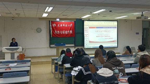 为深入学习宣传贯彻党的二十大精神,广泛学习宣传《天津市文明行为促进条例》,普及消防安全知识,不断推进平安校园消防安全管理工作,加强学生消防安全意识。5月5日9:00,海洋与环境学院在滨海中校区图书馆9-3阶开展了消防安全宣讲暨网格员安全培训会,邀请天津市经开区消防救援支队前来进行宣讲和培训。会议由研究生辅导员李婷申主持,各实验室安全网格员及各年级宿舍管理网格员参会。