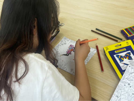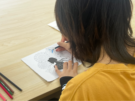 活动开始,活动负责人说明了活动的具体程序,随后在同学们挑选完自己喜欢的曼陀罗图案之后,开始拿起画笔认真填色,在炎热的中午沉淀自己,放松身心。