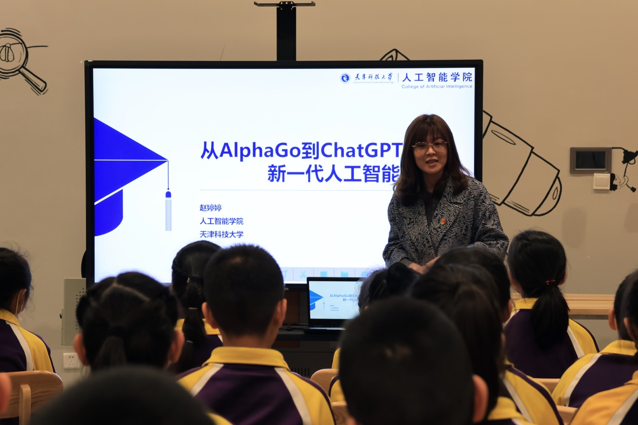 活动开始,师生在滨海科技馆优秀讲解员的带领下参观了滨海科技馆,随后在教室内,气氛活跃,小朋友们徜徉在科技知识的海洋中,“老师,ChatGPT是什么?”“老师,给我们讲讲元宇宙吧!”,人工智能学院副教授赵婷婷老师和研究生石金玉同学分别以“从AlphaGo到ChatGPT:新一代人工智能革命”,“身临其境汲取奋进力量,科技创新助力美好生活”为主题,给大中小学生们上了一堂生动有趣的ChatGPT和VR的科普思政课,深入浅出、引人入胜的讲解吸引了同学们的注意力。