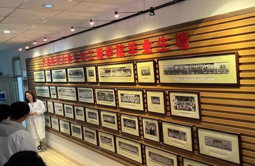 活动的最后一站是平台走廊上醒目的毕业生墙,这面墙上,展示了生物工程学院的悠长人文历史,深厚学科积淀,是生物人“知行合一 至善求是”的精神长廊。