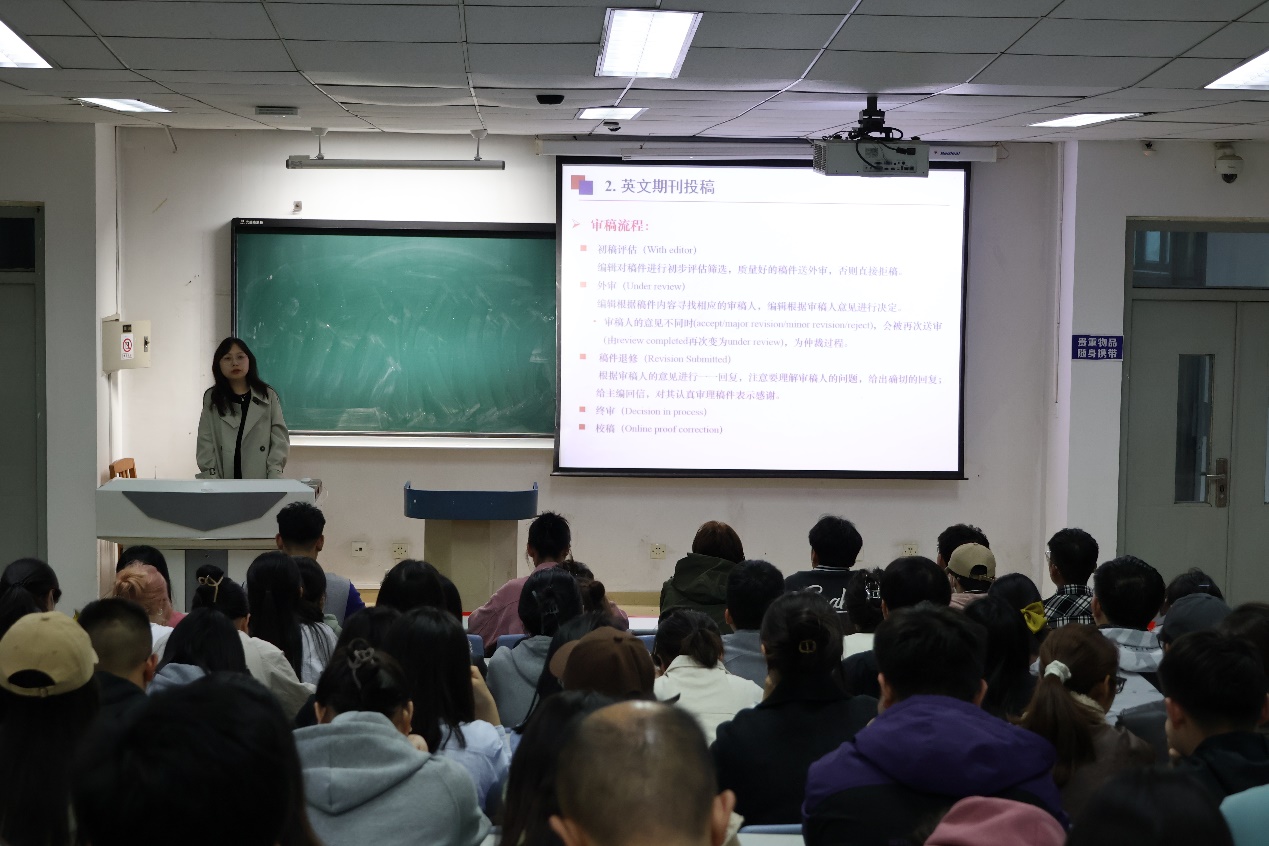 王宇琪同学向参会同学们介绍了科研创新项目申报的基本要求和申报程序,然后分享了英文期刊的投稿经验和审稿流程。此外,王宇琪同学还提供了一些实用的科研小建议,如文章撰写需要注意的细节、英文查重系统的推荐等。通过这次经验分享,同学们对英文期刊的投稿流程和策略有了更深入的了解。