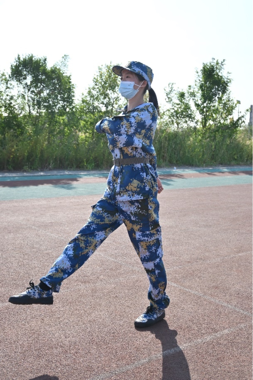 腿部练习!出腿绷直,脚尖下压,脚掌与地面平行,离地面约25厘米。后脚压平,膝盖后顶,保持重心。上身正直,微向前倾。所谓正步,整齐方才悦目,挺直方显气力。正是有了这数不清的小细节,才能使每个人的动作一致、美观,才能使整个队列齐整,才能使整个方阵英姿飒爽,气震平冈!