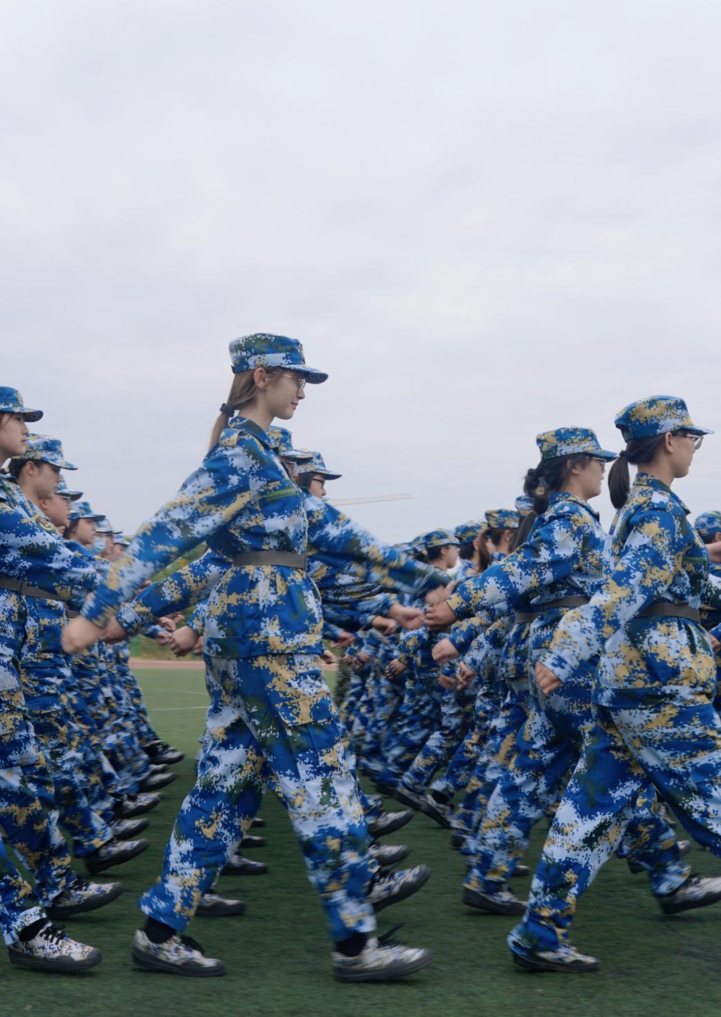 笔直的腰身,挺起的胸膛,整齐的步伐,即使四肢酸痛也丝毫不松懈,“一”在左,“二”在右,摆臂踢腿,透露着少年的气势与坚定,咬紧牙关坚定不移,势要走出军人的强劲风范。