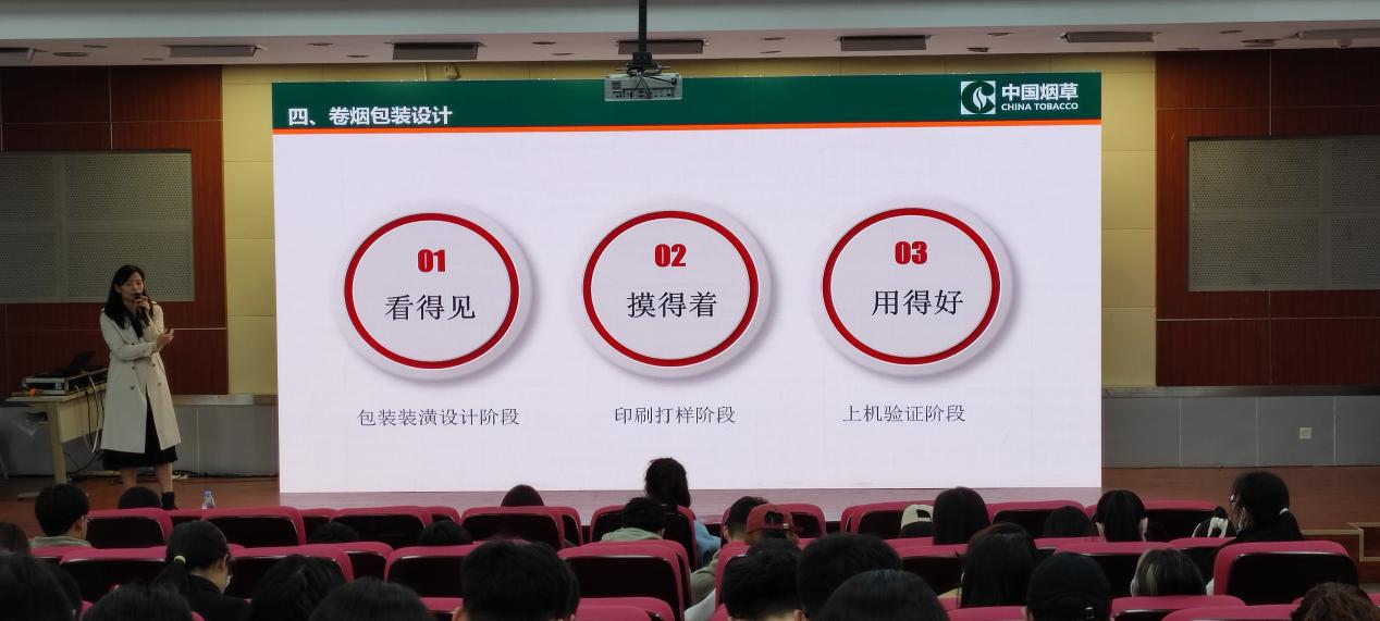 赵雪娜女士从卷烟的发展历程、生产流程、包装材料、包装设计思路及工艺技术等多个方面为同学们做了专业且详细的介绍。她特别强调,在卷烟包装设计过程中,产品包装的整体效果取决于商品商标、图形、文字以及这些要素的组合排列是否能够给消费者带来感官刺激,作品设计中,如果能够将这些要素有机融合,就能够使产品脱颖而出。