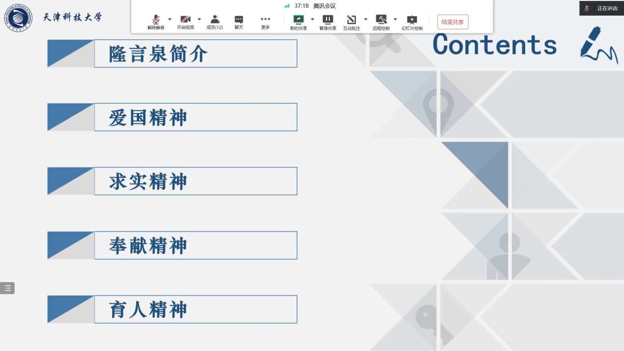 会上,卿子艺同学从隆言泉同志的生平简介、爱国精神、求实精神、奉献精神和育人精神五个方面展开此次主题宣讲。通过宣讲,同学们一同感悟老一辈杰出科研工作者在教学第一线用一生的实际行动践行教育报国、科技强国的爱国精神;学习在科研道路中严谨治学的求实精神;了解在学科开拓和创新过程中淡泊名利、潜心研究,用“小我”成就“大我”的奉献精神;体会在学科传承中以立德树人为目标传道、授业、解惑的育人精神。老一辈杰出科研工作者将自己的知识、技术、经验倾囊相授,这也造就了我国各领域的关键技术得以不断发展提升,实现从跟跑、并跑到领跑的阶段性超越。科技创新,贵在接力,只有将科研火种传下去,科学家精神的火炬才能愈燃愈旺。