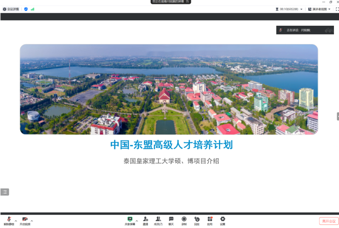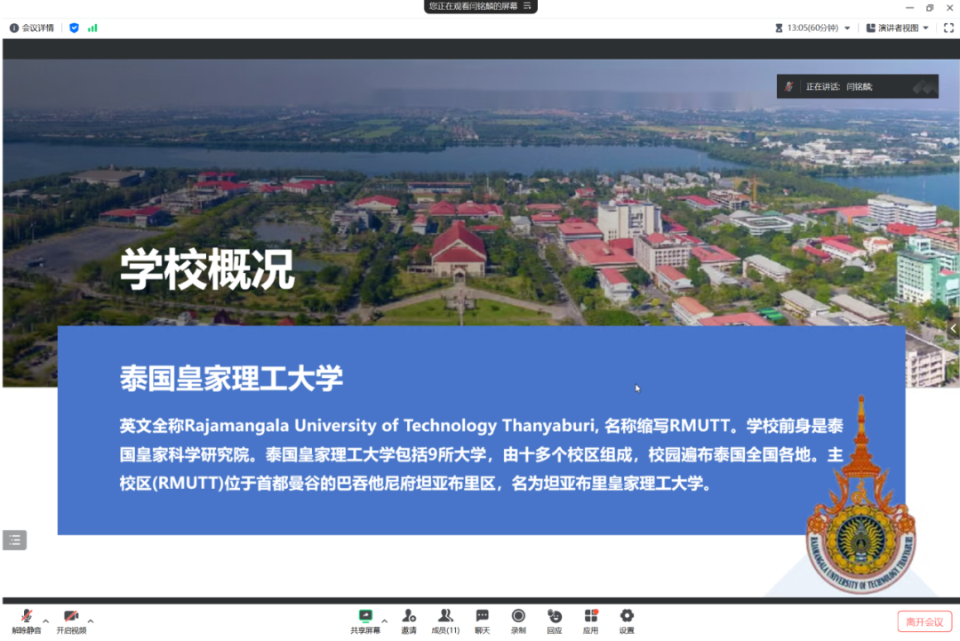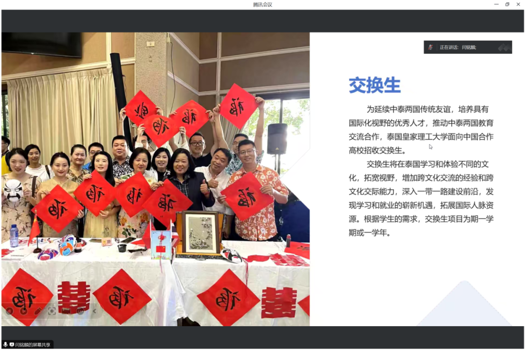 为推动中泰两国传统友谊,响应中国“一带一路 ”号召,在泰国教育部大力支持下,泰国皇家理工大学开设“高端人才培养计划 ”,为“ 中国—东盟自由贸易区 ”和“一带一路 ”建设培养高端人才。因此,文法学院联合泰国皇家理工大学针对学院学生于2024年4月29日在线上进行了分享交流活动,本地活动由闫铭麟老师进行了主讲。