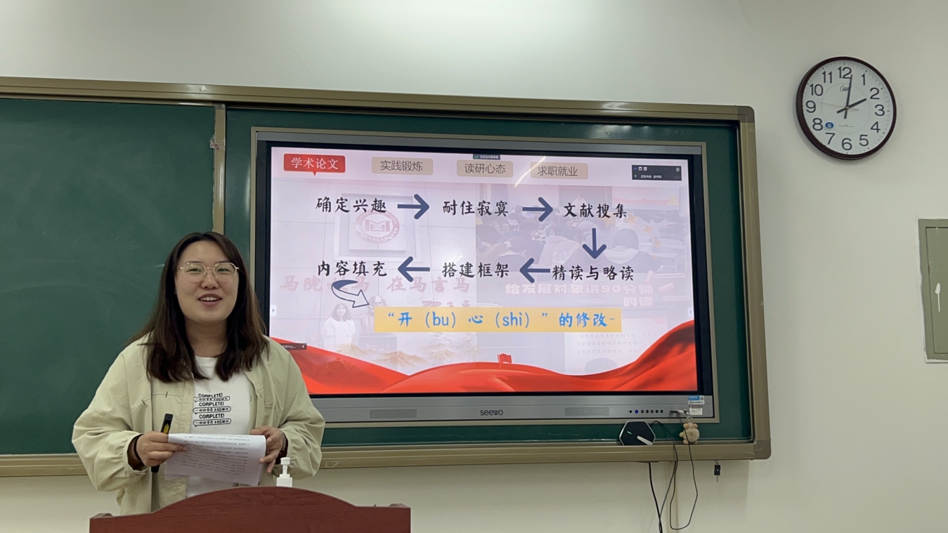 为深入贯彻落实习近平总书记视察天津重要讲话精神,着力推进我校“先锋计划”之“研教卓越”行动在我院落地生根,提升学院管理育人、文化育人、科研育人实效,马克思主义学院积极打造“攀登讲堂”。为激发学生科研学术热情,促进马克思主义学院学子共同成长,我院于4月24日下午在泰达校区7-118以线上线下相结合的方式开展了“渤海风”学术文化季活动暨攀登讲堂第3讲《在坚守学术初心中追求高“研”值》讲座。本次活动由马克思主义学院2021级研究生徐靖楠主讲,马克思主义学院全体在校生、北京师范大学、长安大学、天津滨海职业技术学院等近70余名同学线上参加。